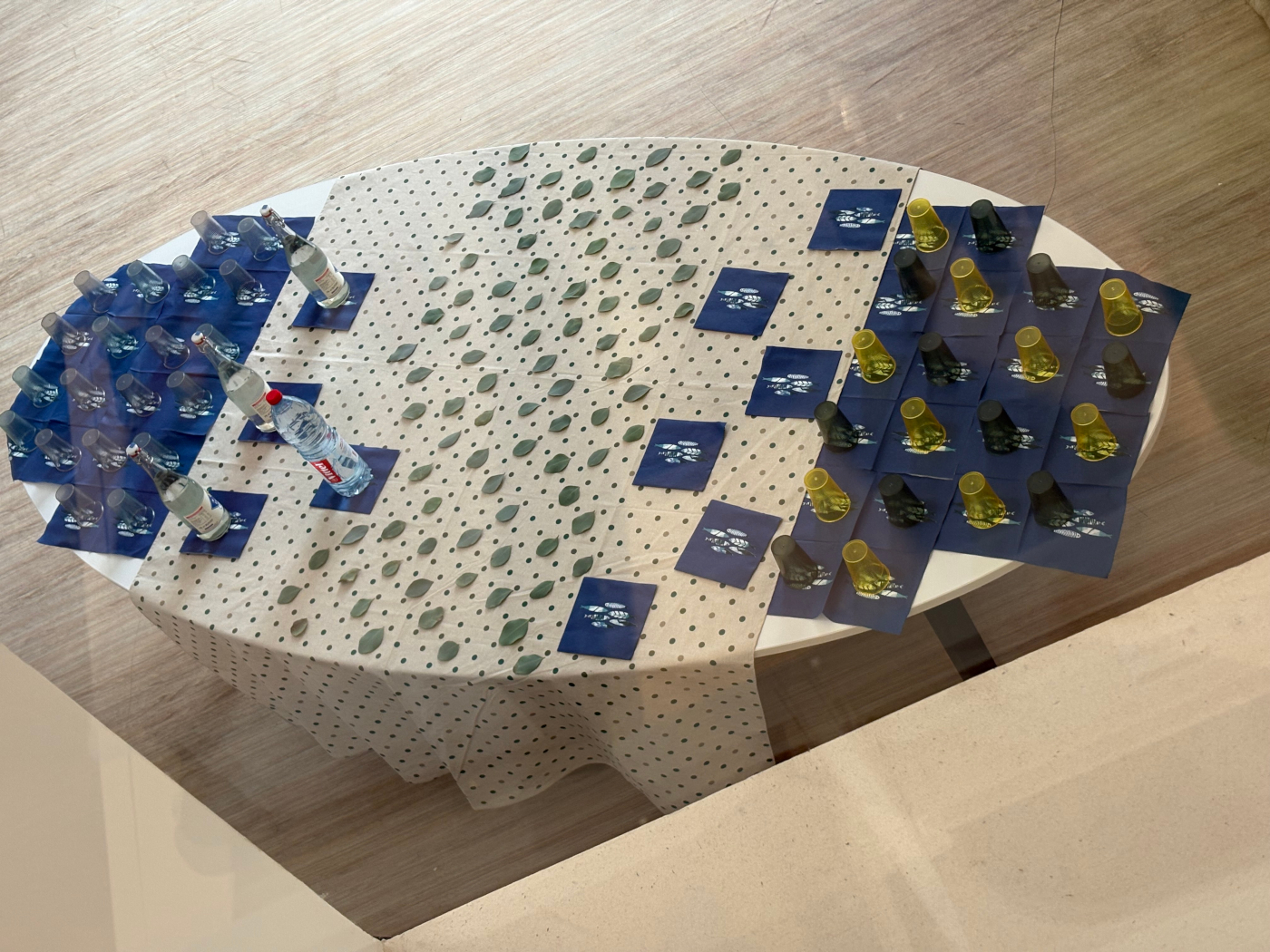 MI-LIEUX Petite ZAD – Installation du 29/10/25 Formatvariable Techniquefeuilles d'eucallyptus sur nappe à pois